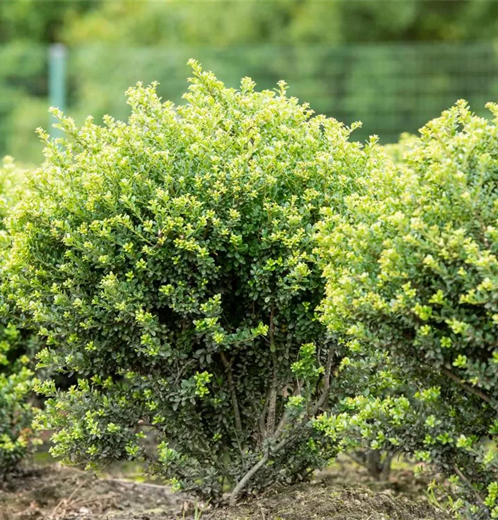 Der Berg-Ilex (Ilex crenata) ist ein gedrungener Strauch mit dekorativen, schwarzen Früchten, die sehr lange haften. Die cremeweißen Blüten erscheinen von Mai bis Juni.