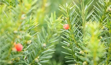 Besonders dekorativ sind die, beerenartigen Zapfen von Taxus x media 'Hicksii'. Diese erscheinen ab September.