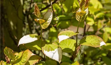 Der Scharfzähnige Strahlengriffel (Actinidia kolomikta) ist eine kletternde, Gartenpflanze mit dekorativen sommergrünen, eiförmigen, mehrfarbigen Blättern.