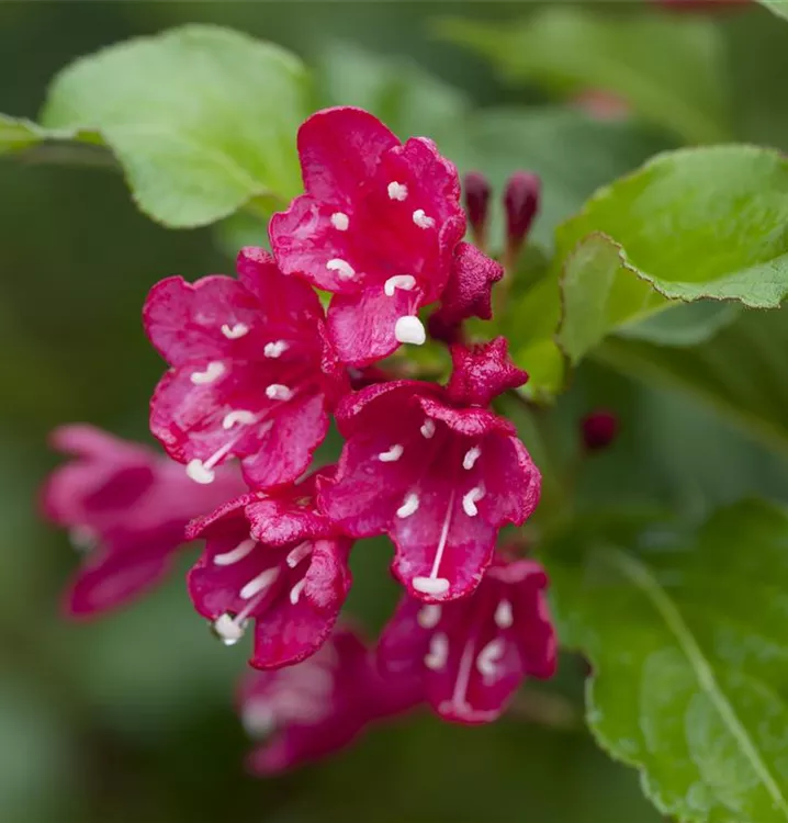 Die Weigelie 'Red Prince' (Weigela) ein kompakter Kleinstrauch, der, je nach Sorte, trichterförmige Blüten in verschiedenen Farben hervorbringt. An einem sonnigen bis halbschattigen Standort mit durchlässigem, lockerem, nährstoffreichem Boden erreicht sie gewöhnlich eine Höhe von ca. 2 m und wird ca. 2 m breit.