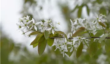Die weißen Blüten der Hängenden Felsenbirne erscheinen in Trauben von April bis Mai.