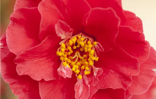 Camellia japonica 'Snow White' bildet während der gesamten Saison zahlreiche gefüllte, weiße Blüten. Diese werden etwa 8 - 10 cm groß.