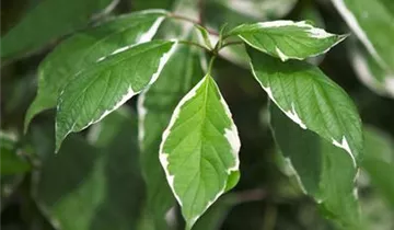 Hoher Blattschmuckwert. Die sommergrünen Blätter des Hartriegels 'Elegantissima' sind dunkelgrün, eiförmig, gegenständig, ganzrandig und weisen einen weißen Rand auf. Diese sind etwa 4 - 8 cm groß. Hartriegel 'Elegantissima' zeigt sich leuchtend karminrot im Herbst.