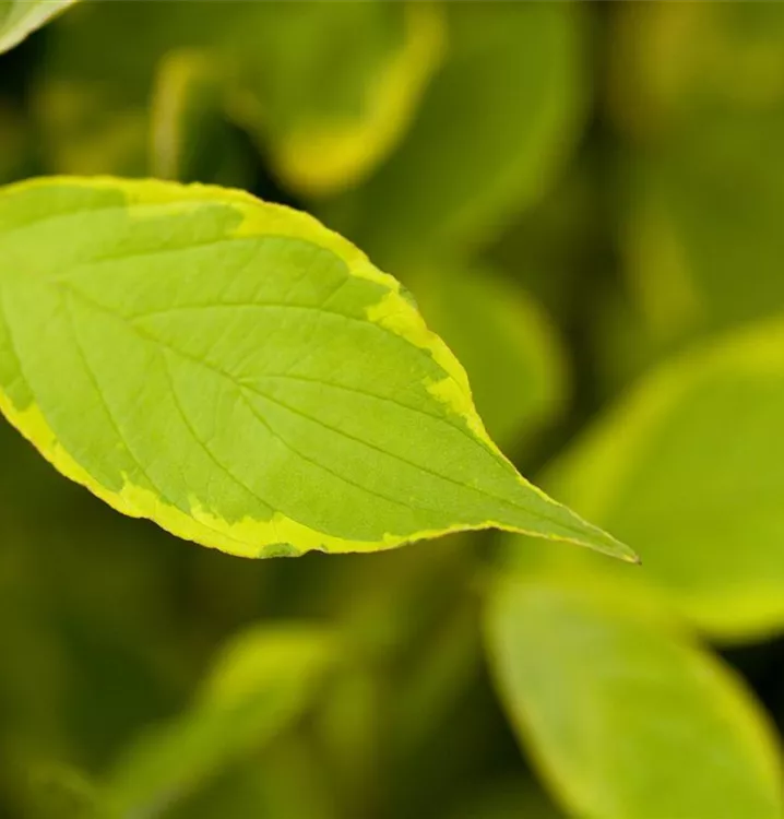 Hoher Blattschmuckwert. Die sommergrünen Blätter des Gelbbunten Hartriegels 'Spaethii' sind mittelgrün, eiförmig, gegenständig, ganzrandig und weisen einen gelben Rand auf. Diese sind etwa 4 - 8 cm groß. Gelbbunter Hartriegel 'Spaethii' zeigt sich leuchtend orange im Herbst.