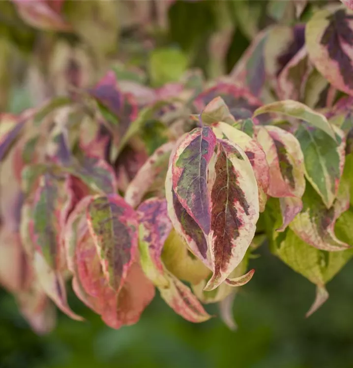 Die sommergrünen Blätter des Amerikanischen Blumen-Hartriegels sind dunkelgrün, lanzettlich, gewellt. Diese sind etwa 7 - 15 cm groß. Amerikanischer Blumen-Hartriegel zeigt sich leuchtend scharlachrot bis violett im Herbst.