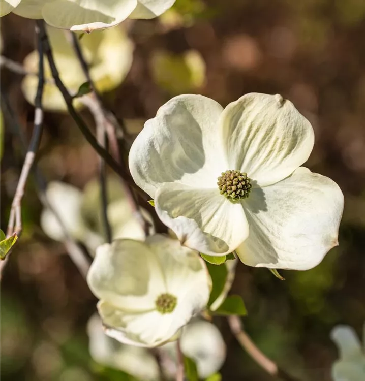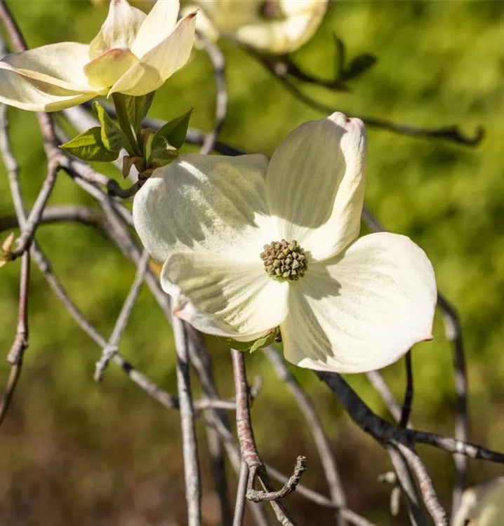 Der Amerikanische Blumen-Hartriegel (Cornus florida) ist ein ausladender, breiter Großstrauch mit dekorativen, scharlachroten, ovalen Früchten. Die Blüten erscheinen je nach Sorte in verschiedenen Farben.