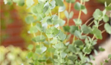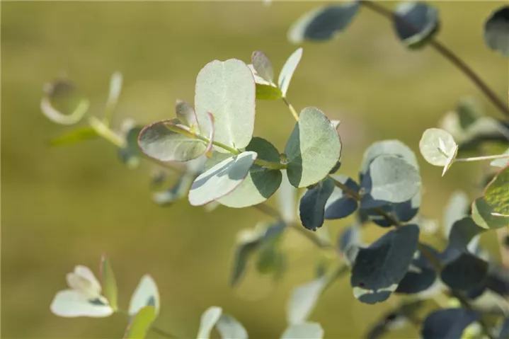 Die immergrünen Blätter des Echten Eukalyptuses 'Azura' sind silbergrau, rundlich.
