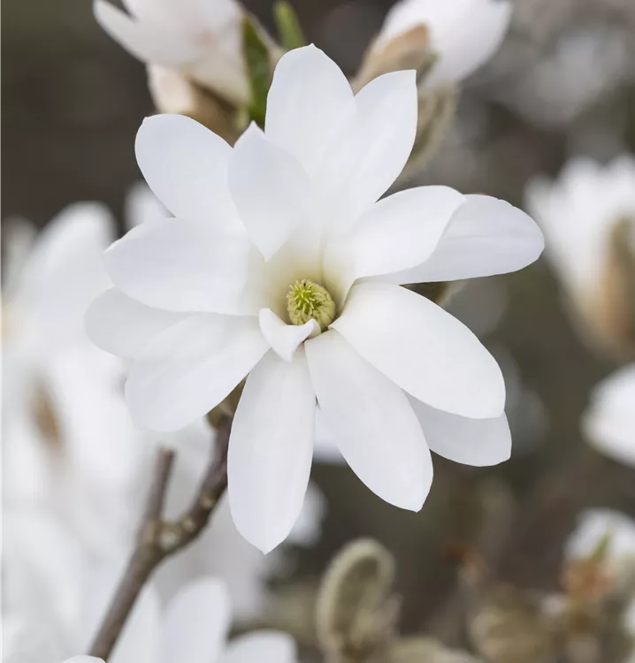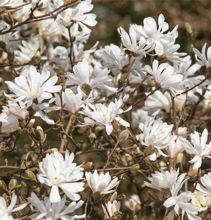 Die Sternmagnolie 'Royal Star' (Magnolia stellata) ist ein buschiger, breiter Strauch, der weiße, sternförmige Blüten hervorbringt. Sie erscheinen von März bis April. An einem sonnigen, windgeschützten Standort mit durchlässigem, humosem, nährstoffreichem Boden erreicht sie gewöhnlich eine Höhe von ca. 3,5 m und wird ca. 3 m breit.