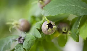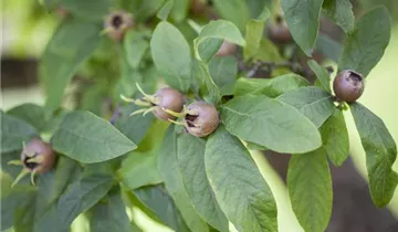 Mespilus germanica bildet braune Früchte mit einem süßen, nussigen Geschmack. Die Fruchtschale dieser flachen Früchte ist rau. Reifezeit ab November.