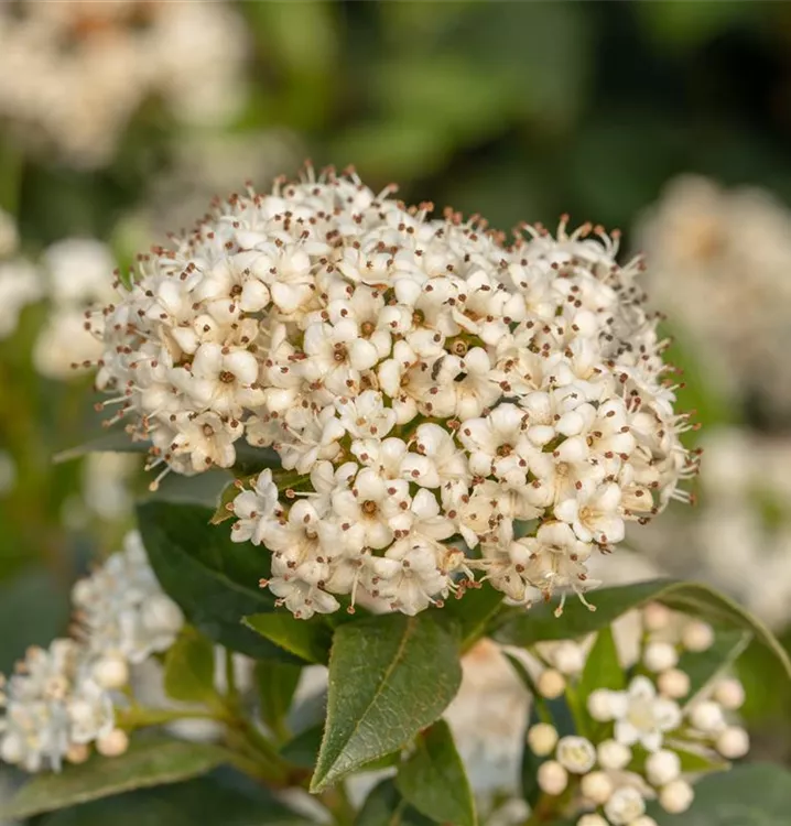 Die cremeweißen Blüten des Prager Schneeball erscheinen in Schirmtrauben von Mai bis Juni. Diese sind stark duftend.