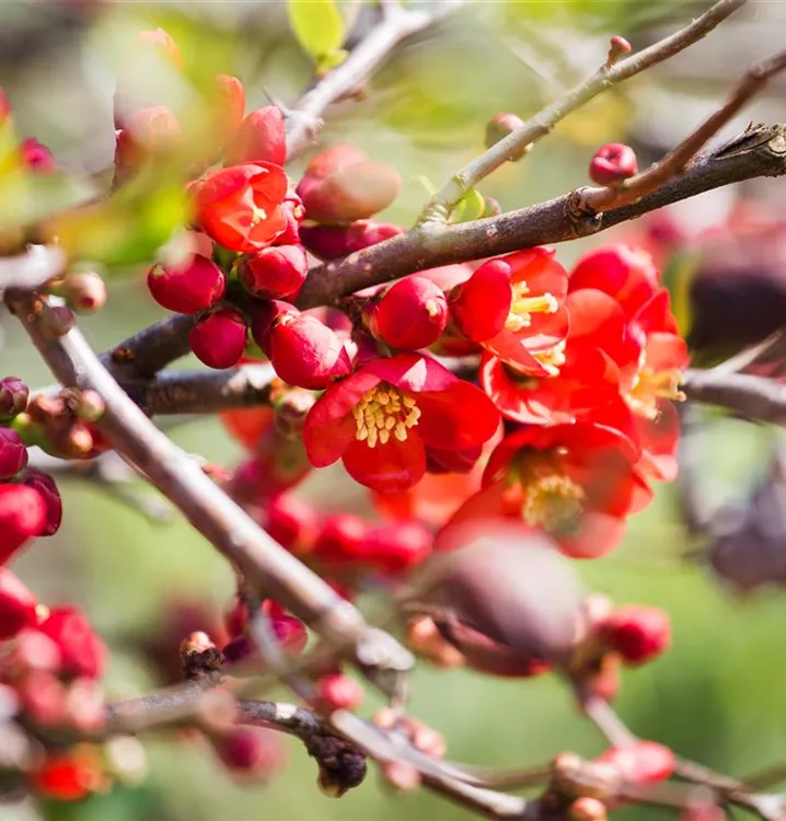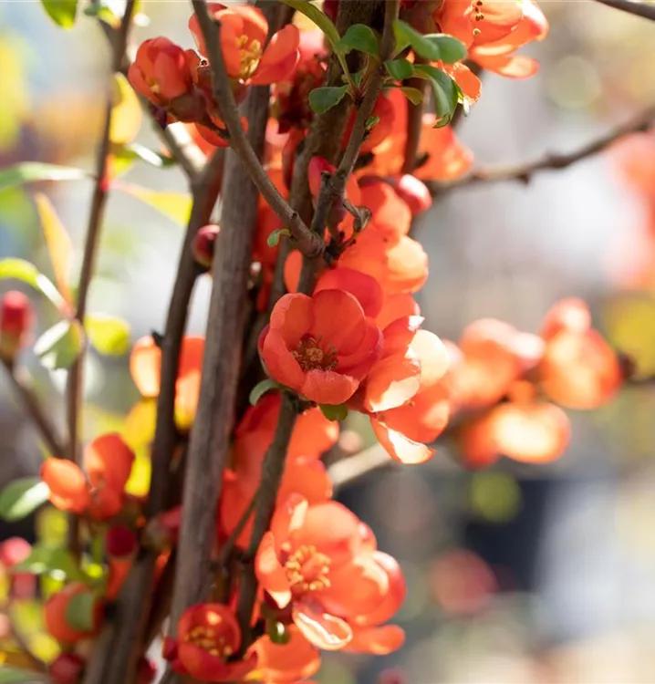 Die Niedrige Scheinquitte 'Sargentii' (Chaenomeles japonica) ist ein ausladender Kleinstrauch mit dekorativen, gelben, orangefarbenen, birnenförmigen Früchten. Diese verströmen einen angenehmen Duft. Die roten Blüten erscheinen von Mai bis Juni.