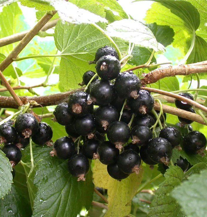 Die Johannisbeere 'Titania'(s) (Ribes nigrum) bildet schwarze, große Beeren. Diese sind süß-säuerlich im Geschmack. Für eine ertragreiche Ernte ab Juli schaffen durchlässiger, nährstoffreicher Boden und ein sonniger bis halbschattiger Standort optimale Bedingungen. Auch ihre grünen Blüten sind eine schöne Erscheinung.