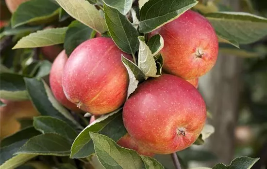 Der Apfel 'Baya® Marisa' (Malus domestica) bildet dunkelrote, knackige Früchte. Sie haben einen süß-säuerlichen, süßen Geschmack. Für eine ertragreiche Ernte ab September schaffen durchlässiger, nährstoffreicher Boden und ein sonniger bis halbschattiger Standort optimale Bedingungen. Auch seine hellrosafarbenen Blüten sind eine schöne Erscheinung.