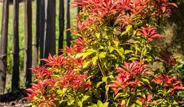 Das Schattenglöckchen 'Mountain Fire' (Pieris japonica) ist ein buschiger, breiter, dichter Kleinstrauch, der weiße, in Rispen angeordnete Blüten hervorbringt. Sie erscheinen von März bis Mai. Besonders dekorativ ist der dunkelrote Jungaustrieb. An einem halbschattigen bis schattigen, windgeschützten Standort mit humosem, nährstoffreichem Boden erreicht es gewöhnlich eine Höhe von ca. 1,3 m und wird ca. 1 m breit.