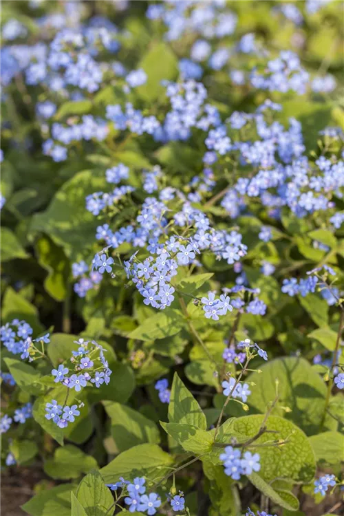 Das Kaukasus-Vergissmeinnicht (Brunnera macrophylla) ist eine ausladende, breite Staude mit dekorativen, herzförmigen, dunkelgrünen Blättern. An einem sonnigen bis halbschattigen Standort mit durchlässigem, humosem, nährstoffreichem, lehmigem Boden erreicht es gewöhnlich eine Höhe von ca. 40 cm und wird ca. 40 cm breit. Das Kaukasus-Vergissmeinnicht ist gut frostverträglich.