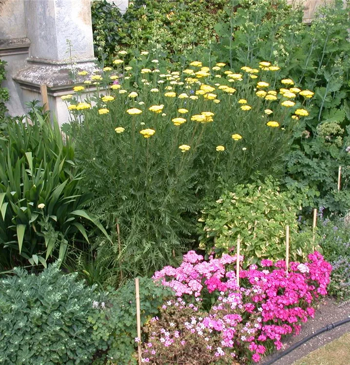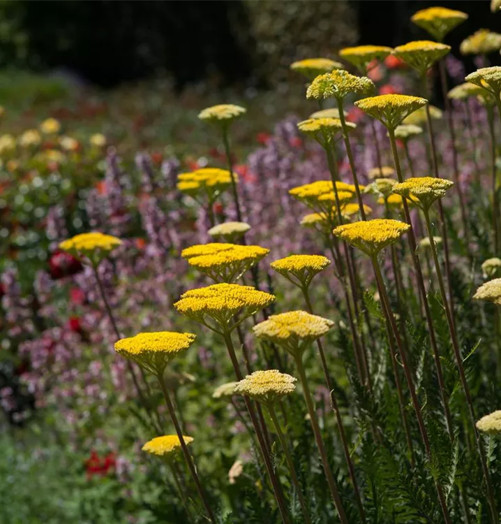 Achillea filipendulina bildet in Dolden angeordnete, gelbe Blüten ab Juni. Diese verströmen einen angenehmen Duft.