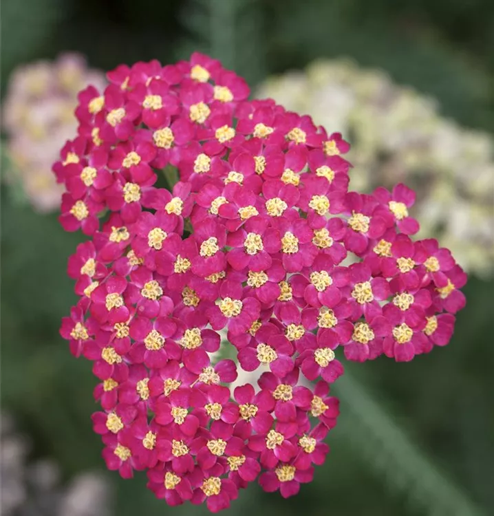Achillea millefolium 'Paprika' bildet in Dolden angeordnete, rote Blüten ab Juni. Diese verströmen einen angenehmen Duft. Bei richtiger Pflege Nachblüte im September.