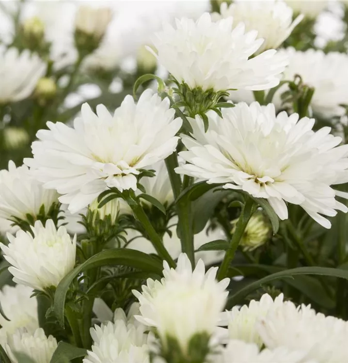Die Glattblatt-Aster (Aster novi-belgii) ist eine aufrechte Staude, die von September bis Oktober weiße, körbchenartige Blüten mit einem angenehmen Duft bildet. An einem sonnigen Standort mit durchlässigem, humosem, nährstoffreichem Boden erreicht sie gewöhnlich eine Höhe von ca. 1,2 m und wird ca. 60 cm breit. Die Glattblatt-Aster ist gut frostverträglich.