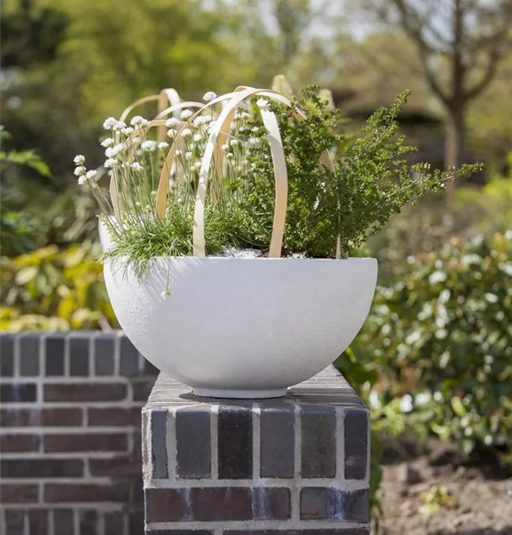 Die Garten-Grasnelke 'Alba' (Armeria maritima) ist eine aufrechte, horstbildende immergrüne Staude, die von Mai bis Juni weiße, ballförmige Blüten bildet. An einem sonnigen Standort mit durchlässigem, nährstoffreichem, sandigem Boden erreicht sie gewöhnlich eine Höhe von ca. 15 cm und wird ca. 15 cm breit. Die Garten-Grasnelke 'Alba' ist gut frostverträglich.
