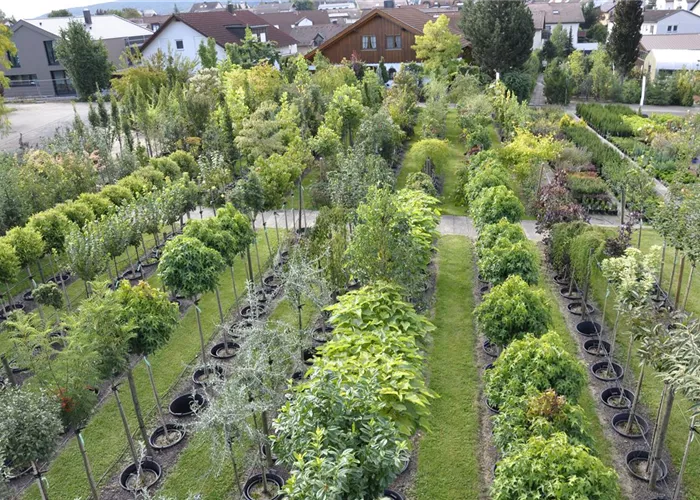 Lediglich Moorbettpflanzen, Stauden und Kletterpflanzen kaufen wir komplett von ausgesuchten Spezialbetrieben zu. Regenwasser wird von Produktionsflächen, Dächern und Wegen in einer 250 000 Liter fassenden Zisterne gesammelt. Reicht dieser Vorrat nicht aus, haben wir einen eigenen Brunnen, der uns von der öffentlichen Wasserversorgung nahezu unabhängig macht. Durch die Umstellung auf die oben erwähnten Bewässerungsarten ist unser Wasserverbrauch zudem deutlich gesunken.